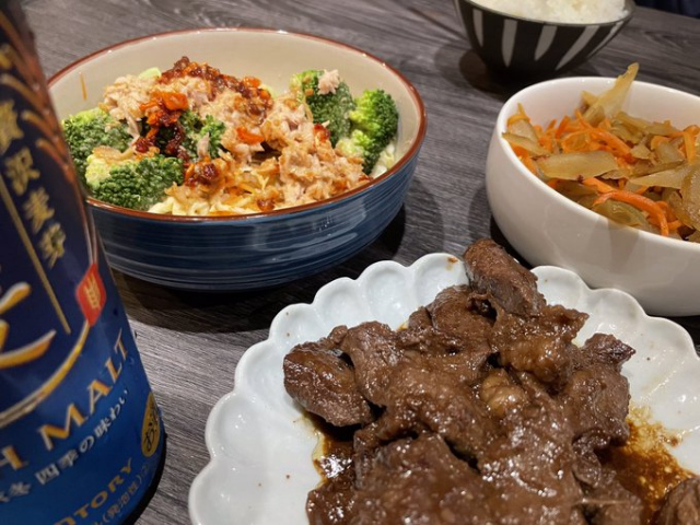帰宅してから30分で「胡麻坦々風サラダ」「きんぴら」「根菜の煮物」「サガリ焼肉」を作ったアタイ...偉い!