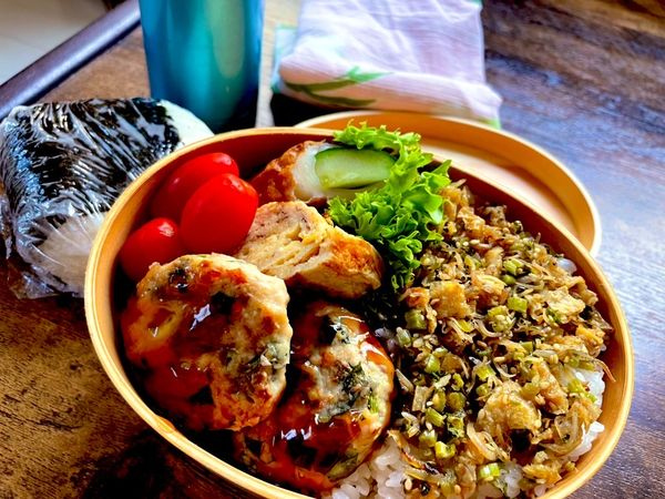 これは旦那用なんですが、朝のおにぎりとお弁当(ジャコとカブ菜の生ふりかけ、つくね、たまごやき、ちくわきゅーり)
