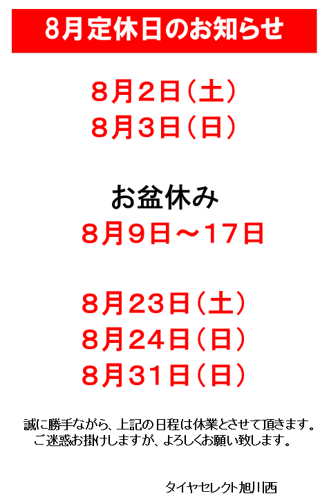 皆さん、こんにちは~ タイヤセレクト旭川西です。