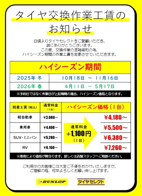 交換作業の混雑緩和の為、ハイシーズン期間の作業工賃を変更させていただいてます。