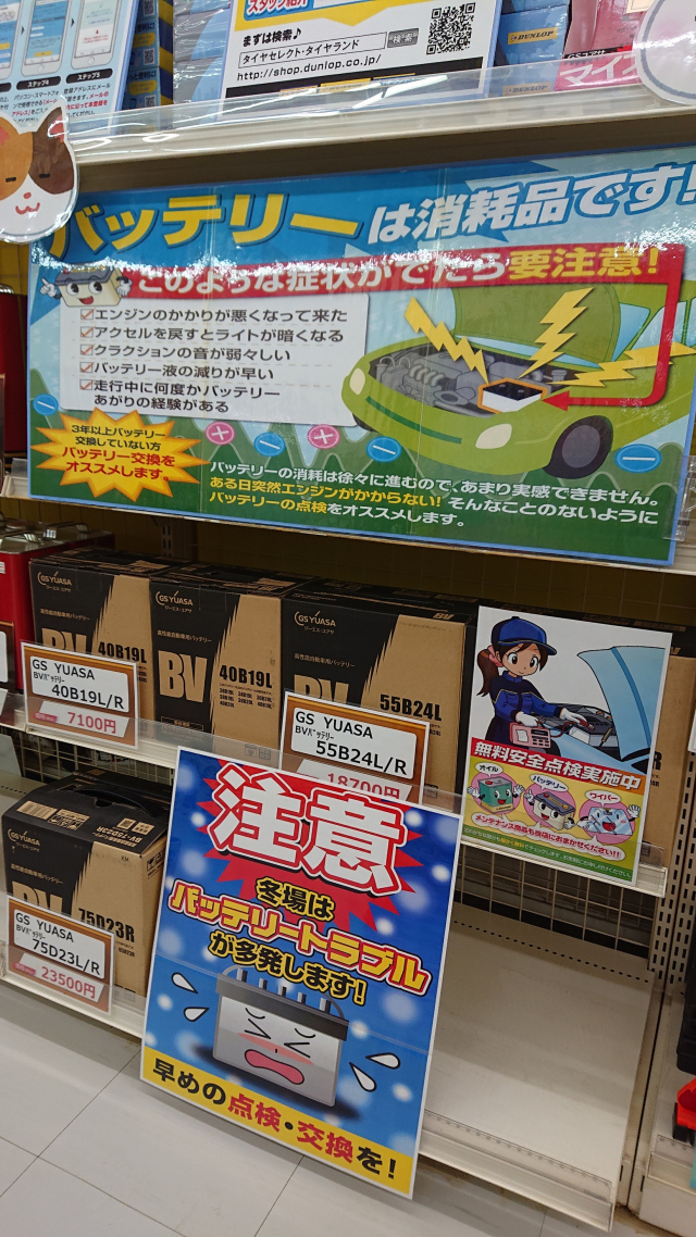【タイヤランド名寄 ショップ日記】 2019/01/23 いつもホームページをご覧頂き、ありがとうございます。 皆さん!こんにちわ~♪ たかしです・・・ ↓今週末あたりから、厳しい冷え込みが続きそうですね・・・ ↑このように気温が低くなると起こりやすいトラブルが・・・ バッテリー上がりです!! ↑3年以上バッテリーを使われている方は 要注意です! ↓突然、バッテリーが上がってしまう前に・・ 「 無料点検 」は、毎日・毎日!実施中!です。 季節がら!「 バッテリー点検 」は重要ですよ! お気軽に、お声掛け下さい。 ↓ タイヤランド名寄♪では!!! 夏タイヤ・冬タイヤ♪ いつでも、ご相談下さい!!! エンジンオイル♪ バッテリー♪ 点検・交換はお気軽に!!! 点検は!いつでも無料♪ 小さな事でも、ご相談下さい。 2019.01.23