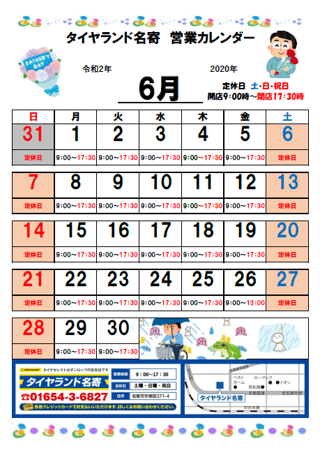 今月、6月は土曜日と日曜日が定休日となります。