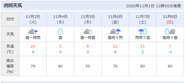 ↑ 11月4日(水)以降も雪の予報が出ております。