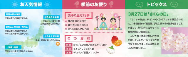 ↑ 3月の ” お天気情報・季節のお便り・トピックス ” を。