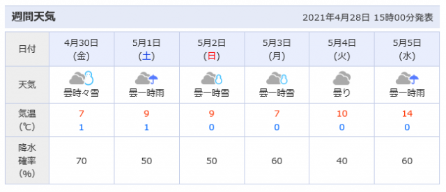 雨ならまだしも・・・雪の予報がチラリ 。。。