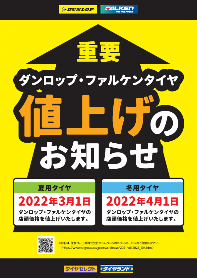 ダンロップタイヤとファルケンタイヤの値上げが