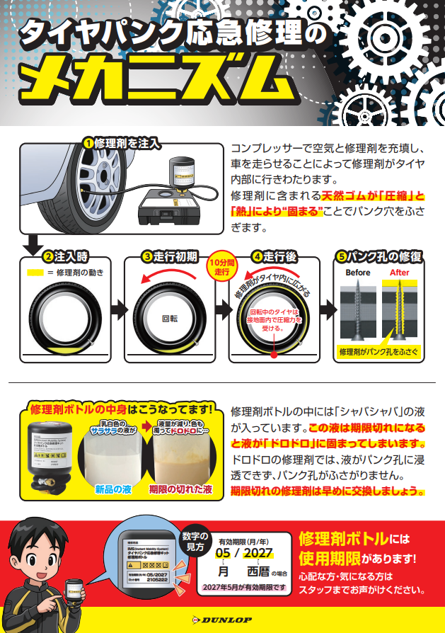 パンク修理材の中にあるゴム分子が経年で