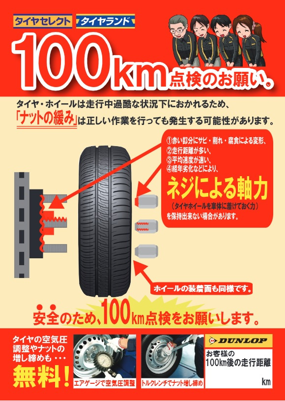 その為、当店ではタイヤ交換後100km前後でのナットの増し締めをお願いしております。