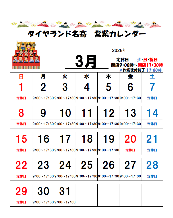 本日は3月の休日案内です!