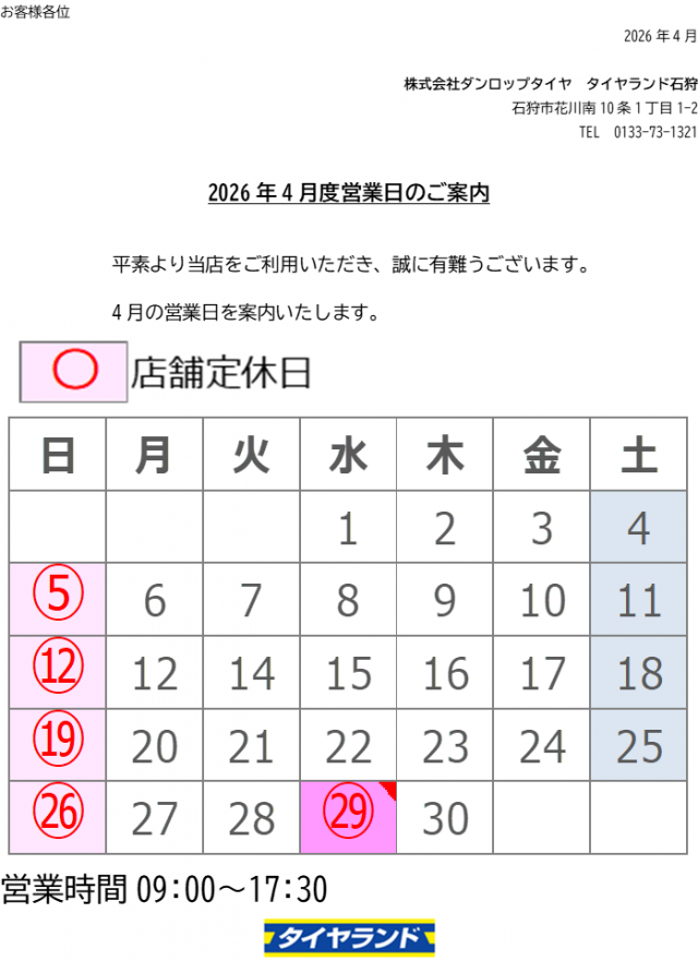 平素より当店をご利用いただき、誠にありがとうございます。 4月定休日は下記の通りとなります。 ご迷惑をおかけいたしますが、何卒よろしくお願い申し上げます。