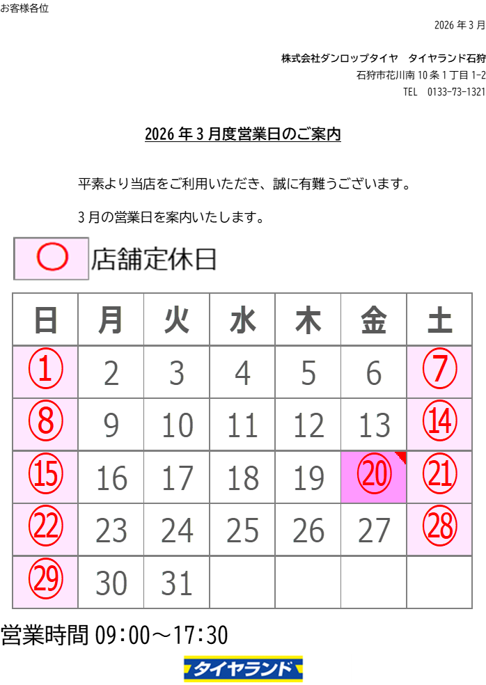 平素より当店をご利用いただき、誠にありがとうございます。 3月定休日は下記の通りとなります。 ご迷惑をおかけいたしますが、何卒よろしくお願い申し上げます。