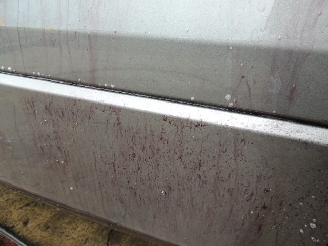 ボディーの鉄粉 こんにちは、M川です。塗装面にびっしり付いた鉄粉取りです。 鉄粉に反応した液体の色はグロテスクです。 作業の価格等についてはお問い合わせ下さい。 仕上げにコーティングもします。 2016.06.15