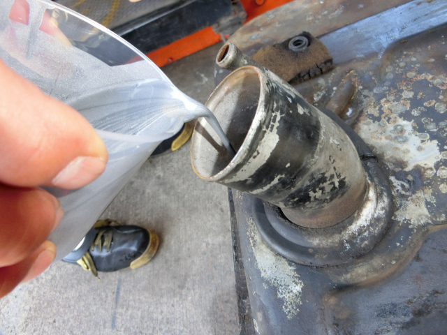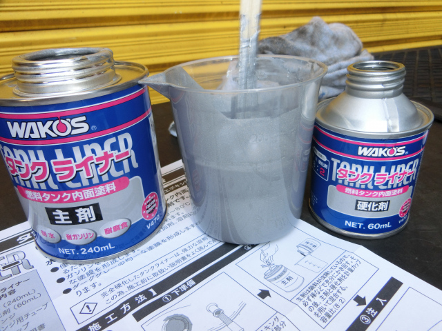 フエールタンクの錆取りです、ワコーケミカルさんを使います、 先日、入れて置いてかなり錆びが落ちました、今度は内部のコーテイングです。