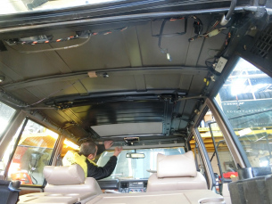 ルーフライニング クラシックレンジローバーです、お決まりの天井の「タレ」です。 この時期の英国車は、100パーセントこのようになります。 新品はもう部品の供給終了で出てきません。 外して、張り替えします。 2016.12.15