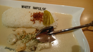 皿の上は、雪をイメージした白いシーフードカレーとご飯
