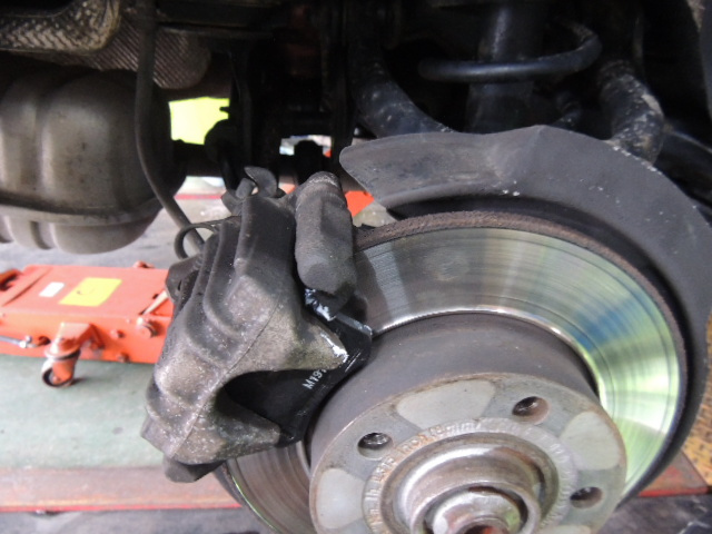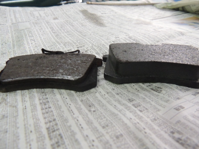 こんにちは、M川です。外はあまりにも寒いのでシャッターを閉め、 中で作業です。外したブレーキパッドは磨耗しきってました。