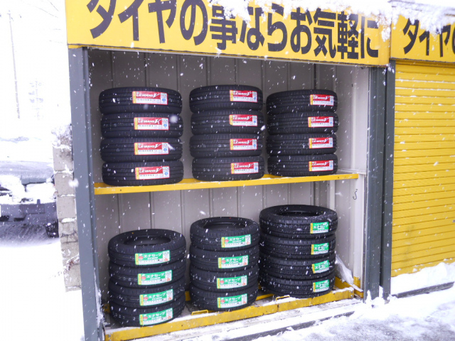 こんにちは三橋です。 まだ積雪がある青森ですが、夏タイヤの展示です。 どうぞお気軽にご来店くださいませ。