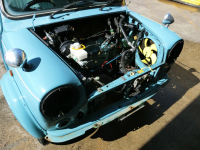 これから仕上げていきます。 今日は、「ホワイトデイ」でも、サーフブルーの Miniの整備のスタートです。 エンジン&ミッションを降ろして、分解O/Hします。 ボデイは、板金屋さんで綺麗にしてもらいます。 2017.03.14