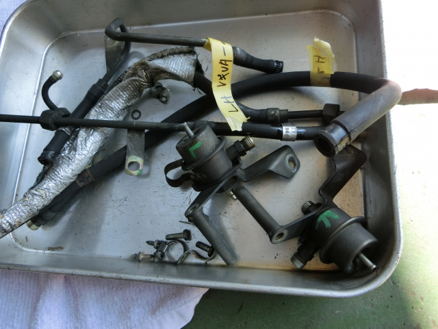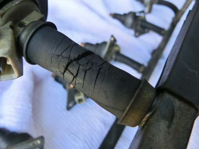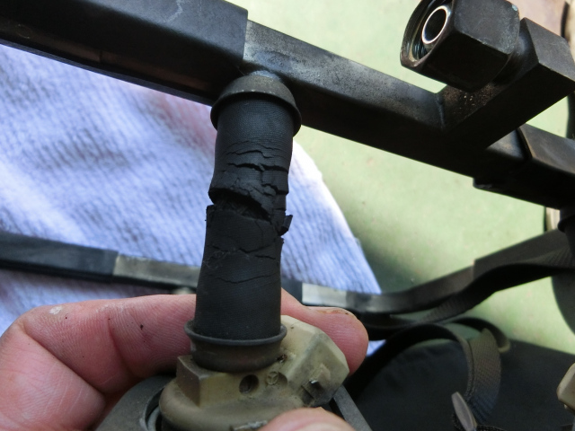 おっと、危ない!! ダイムラーW6です、エンジンルームを点検していたら、フエールホースの 劣化に気づきました。これでは何時ガソリンが漏れてもおかしくありません。 早速取り外して、治さないと危険です。 2017.06.09