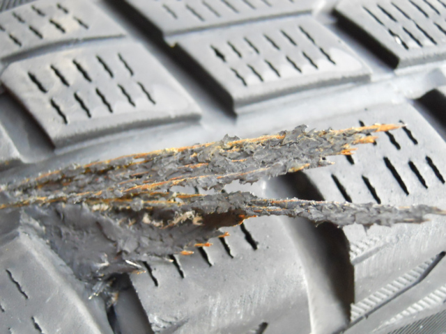 トレッドが剥がれてワイヤーが切れています。