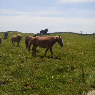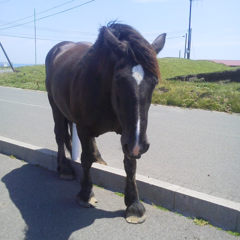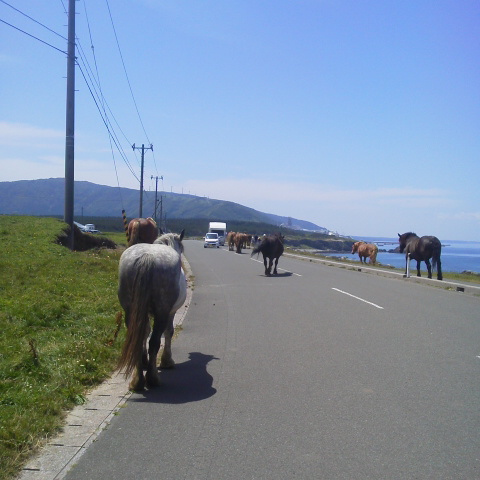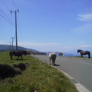 こんにちは、M川です。先日、下北半島の尻屋崎に行ってきました。 放牧されている馬(寒立馬)がいる所です。 道路の馬を初めて見る人は驚きの光景だと思います。
