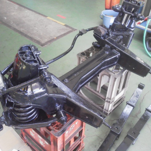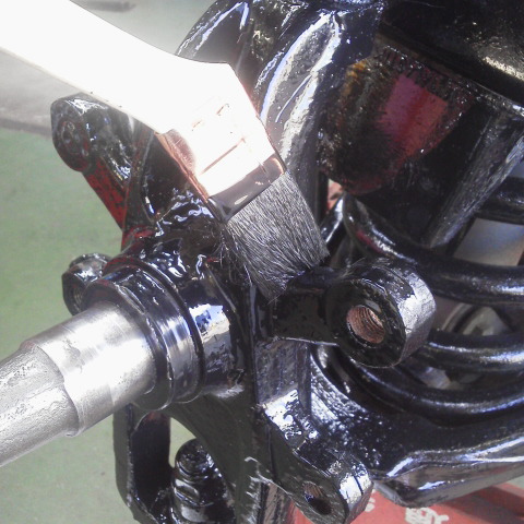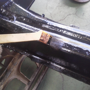 こんにちは、M川です。錆び止め塗装です。 今回はハケ塗りです。手間はかかりますが、 こっちのほうが塗膜が厚く仕上がりますので 耐久性があります。