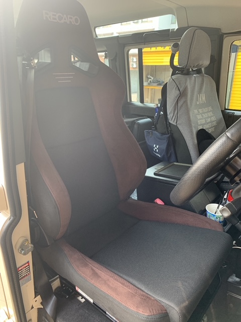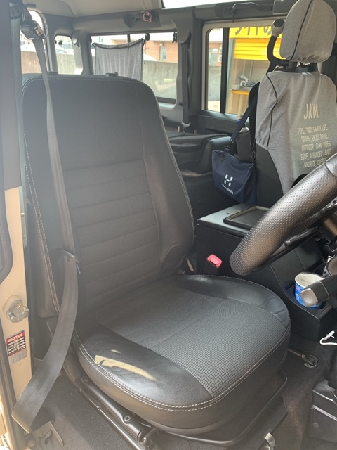 レカロシート こんにちは、M川です。ディフェンダーのシートをレカロに 交換です。専用のシートレールも有りますのでシートのポジションの 微調整も楽です。シートヒーター付も有りますので冬はありがたいですね。 2021.06.15