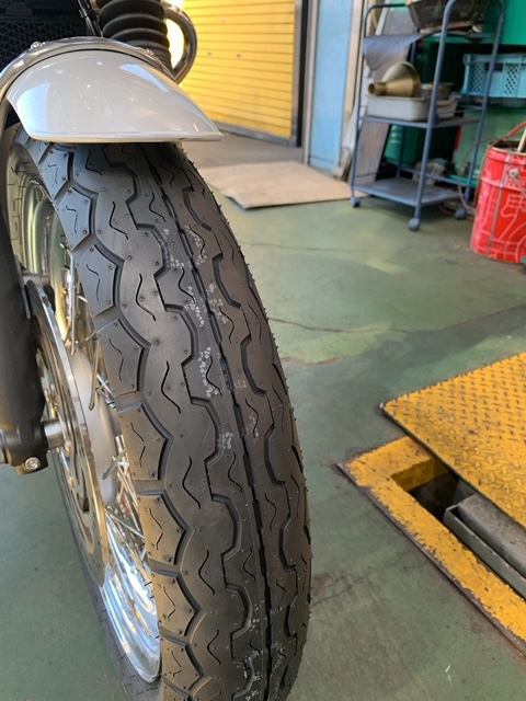 トライアンフ こんにちは、M川です。トライアンフボンネビルT120のタイヤ交換です。 新車なのでタイヤはほぼほぼ新品ですが、新車装着タイヤのパターンが カッコ悪いので交換。やっぱりTT100GPでしょ! 2021.08.31