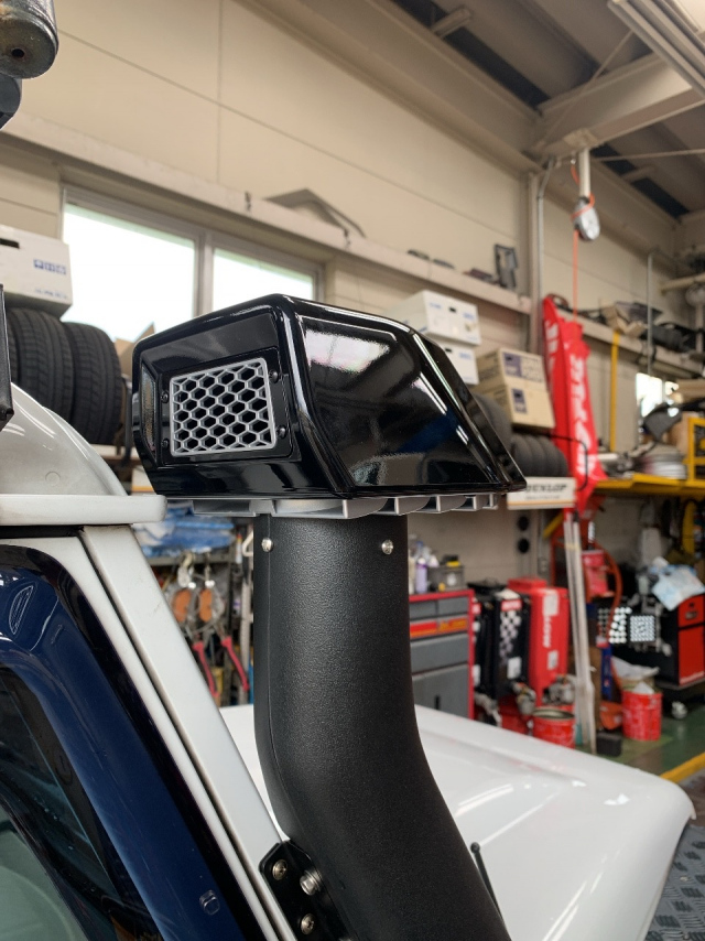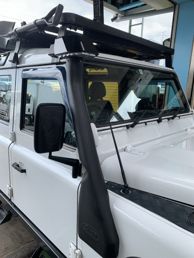こんにちは、M川です。ディフェンダーにスノーケルダクトの 取付です。これで思いっきり水の中に入れます❓
