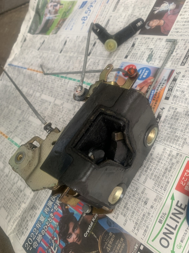 こんにちは、M川です。ディスカバリー1のドアラッチの修理です。 以前はドアラッチをアッセンブリー交換していましたが、破損してる 部品が入手できたので修理しています。