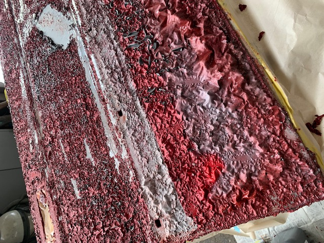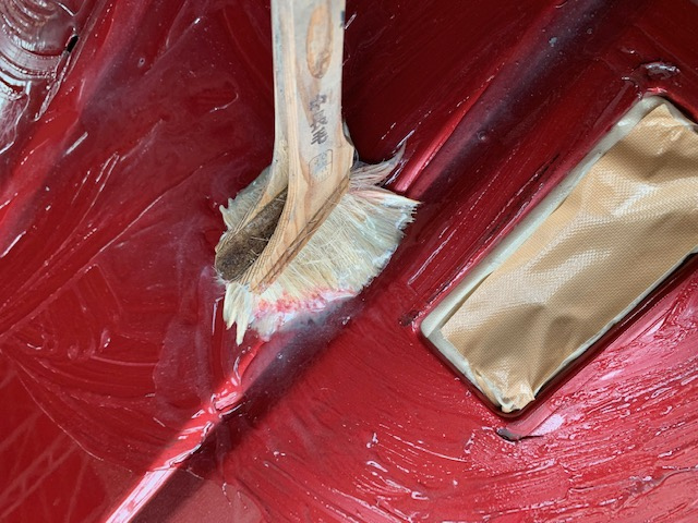 こんにちは、M川です。二回目の全塗装をするため、 古い塗装をはぎ取ります。 塗膜が分厚いので、地道な作業です。
