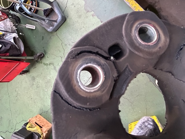 こんにちは、M川です。DISCO1のプロペラシャフトラバーカップリング の交換です。大きな亀裂が出る前の交換をお勧めします。