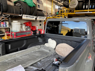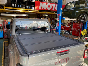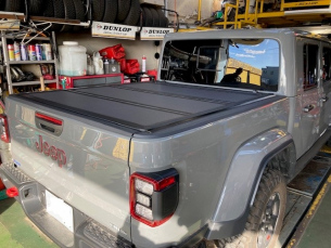 トノーカバー。 こんにちは三橋です。 お得意様のグラディエーター。 トノーカバーを購入されたので、 持ち込まれました。 クルマ側には取付け用のねじ穴がありますので、 ほぼボルトオンで取付けできました。 かっこいいですね~ 2023.11.02