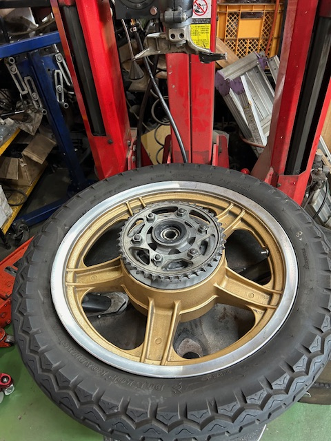 こんにちは、M川です。友人のカワサキ900スーパー4(Z1)のタイヤ交換です。 タイヤはTT100をチョイス。ハヤシレーシングのキャストホイールがキマリます。