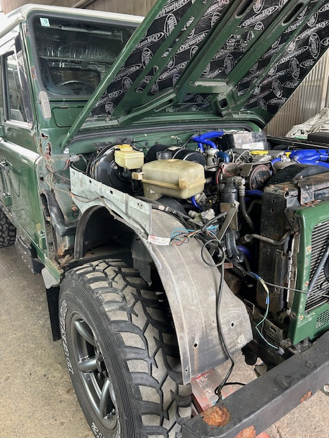 こんにちは、M川です。ディフェンダーのバルクヘッド修理とウイングパネル(フロントフェンダー) 交換です。まずはバラシていきます。