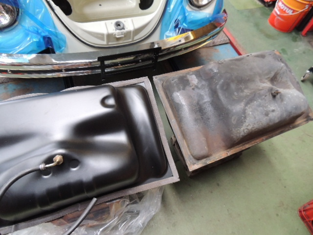 こんにちは、M川です。ビートルの燃料タンク交換です。 いっしょに、ネックホースやセンダーユニットも交換です。 これでタンク内のサビが原因のトラブルは回避できます。