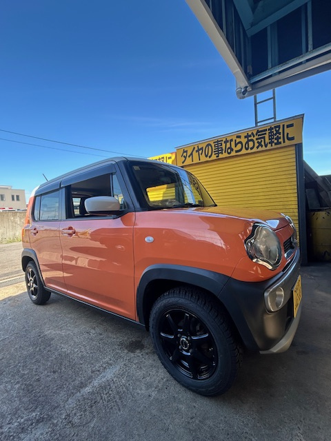 お得意様のスズキハスラーです。 ノーマルタイヤ、ホイールからイメチェンです。 大分ワイルドな感じになりました。 次回は車高アップ❓