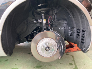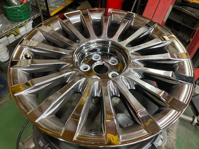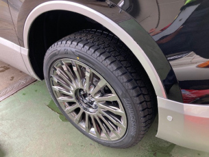 こんにちは三橋です。 今シーズン初のスタッドレスタイヤ交換です。 クルマはセンチューリーSUV! タイヤは22インチ! ブレーキも大きいです!
