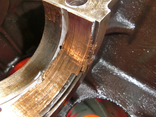 オーバーホール中のエンジンです、クランクシャフトの親メタルがご覧の通りです。