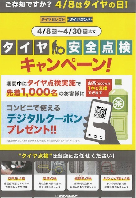 タイヤセレクトでは4/8(水)~4/30(木)まで『タイヤ安全点検キャンペーン』を実施中! GWにお出かけ予定の方、愛車のタイヤ点検はいかがですか?