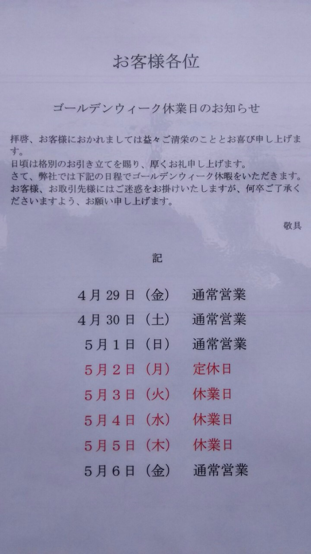 ゴールデンウィーク休業のご案内です。