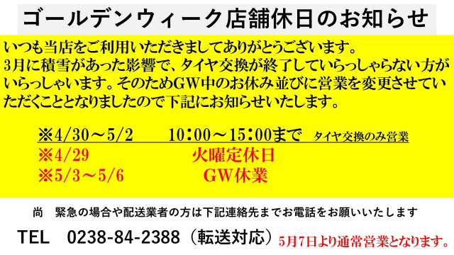 いつも当店をご利用いただきまして誠にありがとうございます。 GWの当店営業日の変更のお知らせとなります 4月29日 火曜定休日 4月30日~5月2日 10:00~15:00(人員を減らし営業) ※タイヤ交換及びパンク修理など対...