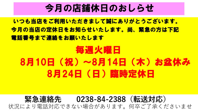 いつも当店をご利用いただきまして 誠にありがとうございます。 8月お盆期間および8月中の店舗お休みの お知らせです。 お盆休み 8月10日(祝)~ 8月14日(木) 臨時定休日 8月24日(日) お盆期間は 8月15日(金)よ...