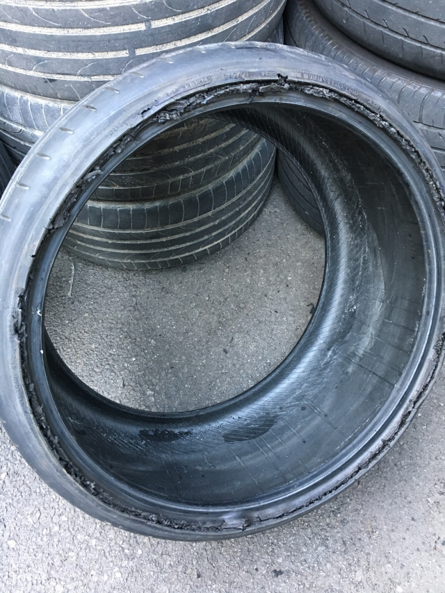 画像では解りにくいかもしれませんが1枚目の画像タイヤの中、黄線の部分が剥離して膨らんでいます。ホイールに着いた状態で外側からの確認は出来ません。そのまま気が付かずに走行を続けてしまうと2枚目の画像のようにバラバラにバーストしてしまいますので、タイヤは残り溝やキズ、ヒビ割れなどの外観から解る不具合以外にも内部の目に見えない不具合も発生しますので使用年数の管理も重要です。高速道路の走行が多かったり重い車又は空気圧の低い状態で走行したタイヤは特に注意が必要です。使用期間が3年を過ぎたあたりから注意してください。