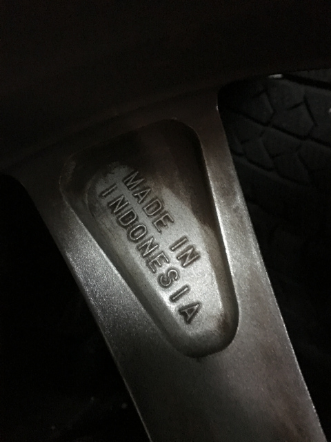 純正ホイール。 国産高級車の純正ホイールのタイヤ交換です。20インチですのでかなり高額なホイールなのでちょっと緊張しましたが無事終了。意外だったのがこの高額ホイールはインドネシア製みたいですね。 2018.10.12