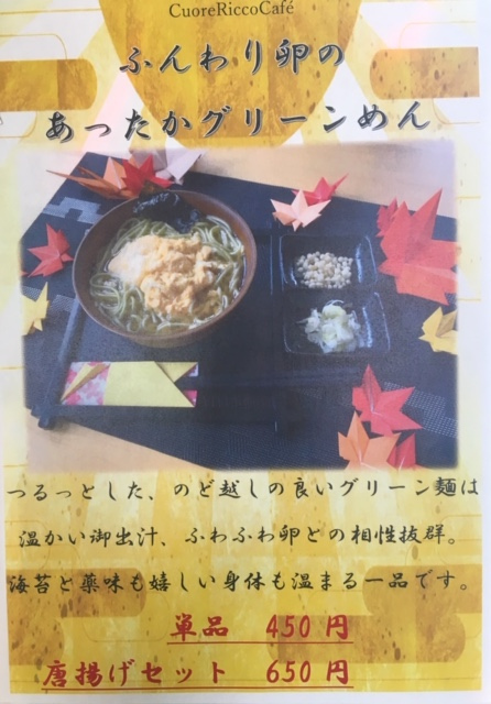 温かい御出汁とふんわり卵の相性抜群、ふんわり卵のあったかグリーンめん!
