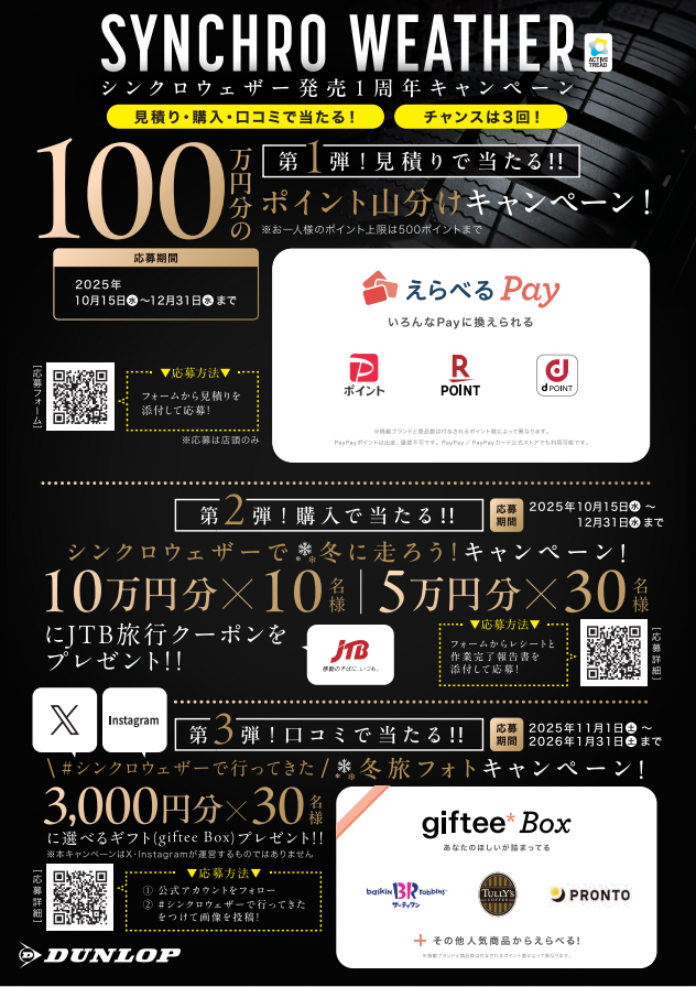 こんにちは!タイヤランド空港店です! キャンペーン告知です! 10/15~12/31までの期間に第1.2弾 11/1~2026年1/31までの期間に第3弾 とシンクロウェザー1周年キャンペーン開催中です! お見積り・購入・レビューで...
