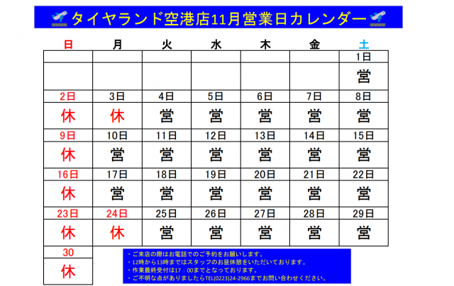 こんにちは!タイヤランド空港店です! 11月の営業日カレンダーを掲載させていただきます! 今月は土曜日すべて営業致します! 交換シーズンになりますので混雑が予想されます。 ご来店の前にお電話でご予約ください!...
