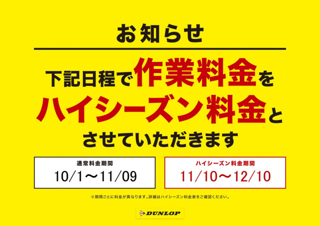 こんにちは!タイヤランド空港店です! 急な告知になりますが、ハイシーズン料金といたしまして11月10日~12月10日の期間のみ作業料金を変更させて頂きます。 詳しい内容については電話でのお問い合わせ、また...