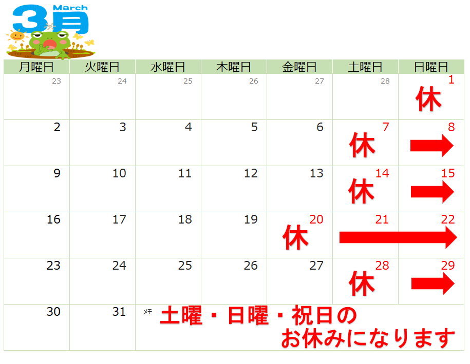 3月 定休日のお知らせ いつもお世話になっております。タイヤランド石巻です。 今回は、3月の休日案内になります。 土曜・日曜・祝日 お休みになります。 平日のご案内になってしまいますが、皆様のご来店お待ちしております! 2026.02.24